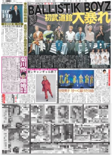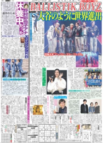 ★掲載内容:LDH,BALLISTIK BOYZ,奥田力也,松下優也,小田和正,バイフーン,伊藤健太郎,リリー・フランキー,斎藤工,寛一郎,SMILE-UP.,STARTO,timelesz,菊池風磨,村上信五,Snow Man,目黒蓮,EBiDAN,M!LK,佐野勇斗,トリリオンゲーム,波瑠,川栄李奈,高杉真宙,ドアラ,高橋遥人,近本光司