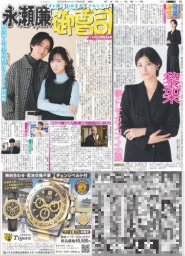 ★掲載内容:木村拓哉,グランメゾン・パリ,鈴木京香,及川光博,中村アン,G1,中央競馬,有馬記念,岡田彰布,皆藤愛子,SMILE-UP.,STARTO,King&Prince,永瀬廉,なにわ男子,西畑大吾,御曹司に恋はムズすぎる,高石あかり,柄本佑,沢口愛華,佐藤輝明