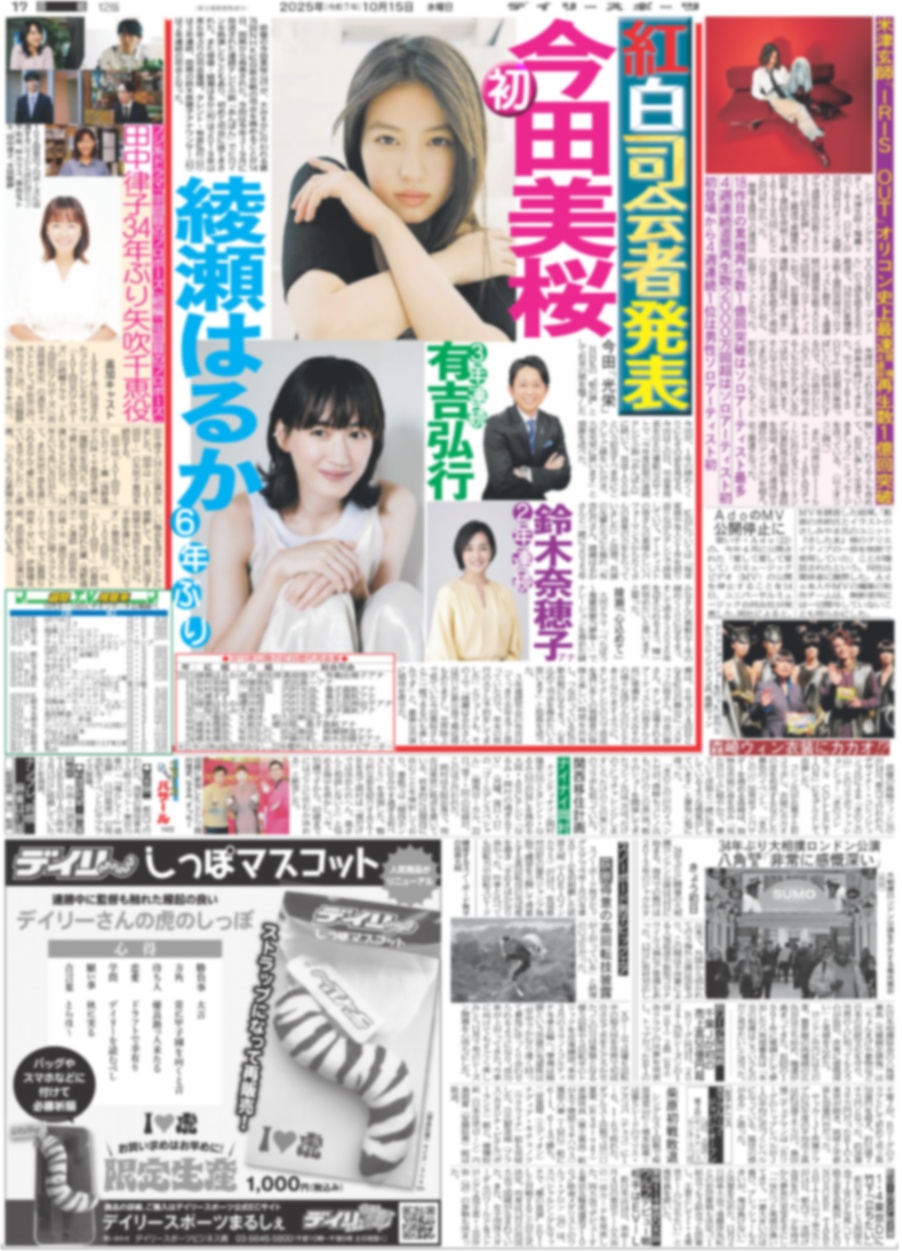 ★掲載内容:SMILE-UP.,STARTO,AmBitious,真弓孟之,SUPER EIGHT,村上信五,今田美桜,綾瀬はるか,有吉弘行,鈴木奈穂子,内田有紀,米津玄師,田中律子,石田亜佑美,宅間孝行,森崎ウィン,佐藤輝明,近本光司,サッカー日本代表
