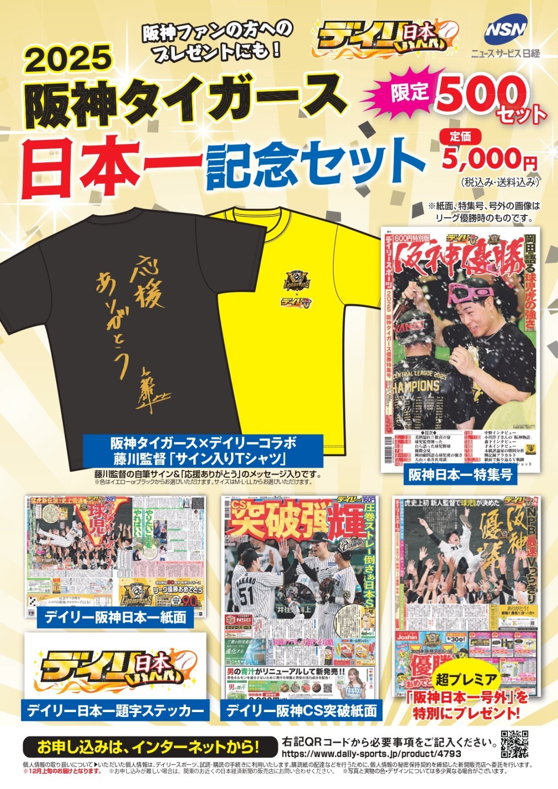 「藤川監督サイン入りTシャツ」、「阪神日本一特集号」「デイリー阪神日本一紙面」、「デイリー阪神CS突破紙面」「デイリー日本一題字ステッカー」に加え、超プレミアの「阪神日本一号外」を特別にプレゼント!