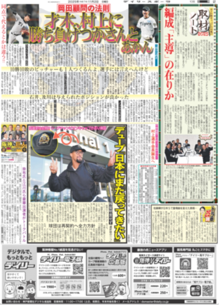 ・中面:岡田顧問の法則 才木、村上に勝ち負けつかさんとあかん