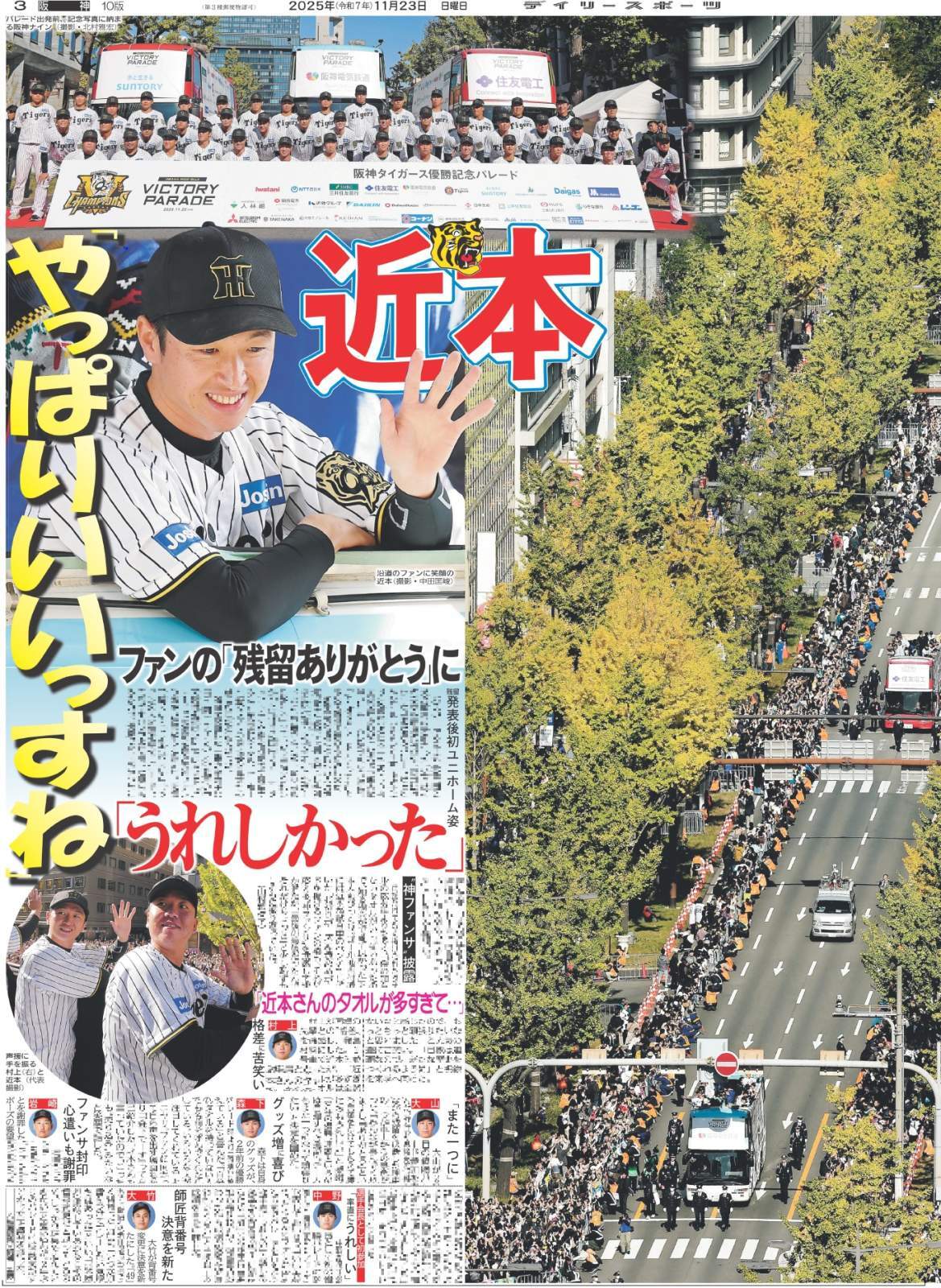 阪神優勝パレード 球児監督「連覇を必ず成し遂げます」/ Snow Man 目黒蓮 「生涯一緒にいたい人に」(東京版)2025年11月23日付