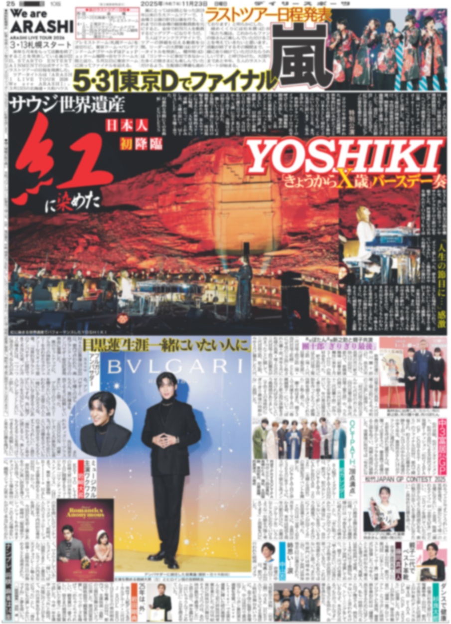 ★掲載内容:阪神タイガース,藤川球児,近本光司,YOSHIKI,SMILE-UP.,STARTO,嵐,Snow Man,目黒蓮,KEY TO LIT,岩崎大昇,OCTPATH,市川團十郎,藤岡真威人,LDH,三代目 J SOUL BROTHERS,岩田剛典,杉良太郎,中山忍