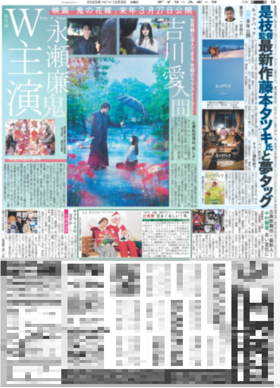 King&Prince 永瀬廉 吉川愛 W主演 / timelesz 圧倒的な活躍に充実感 / デップ ジャパンプレミアに赤西仁サプライズ登場(東京版)2025年12月3日付