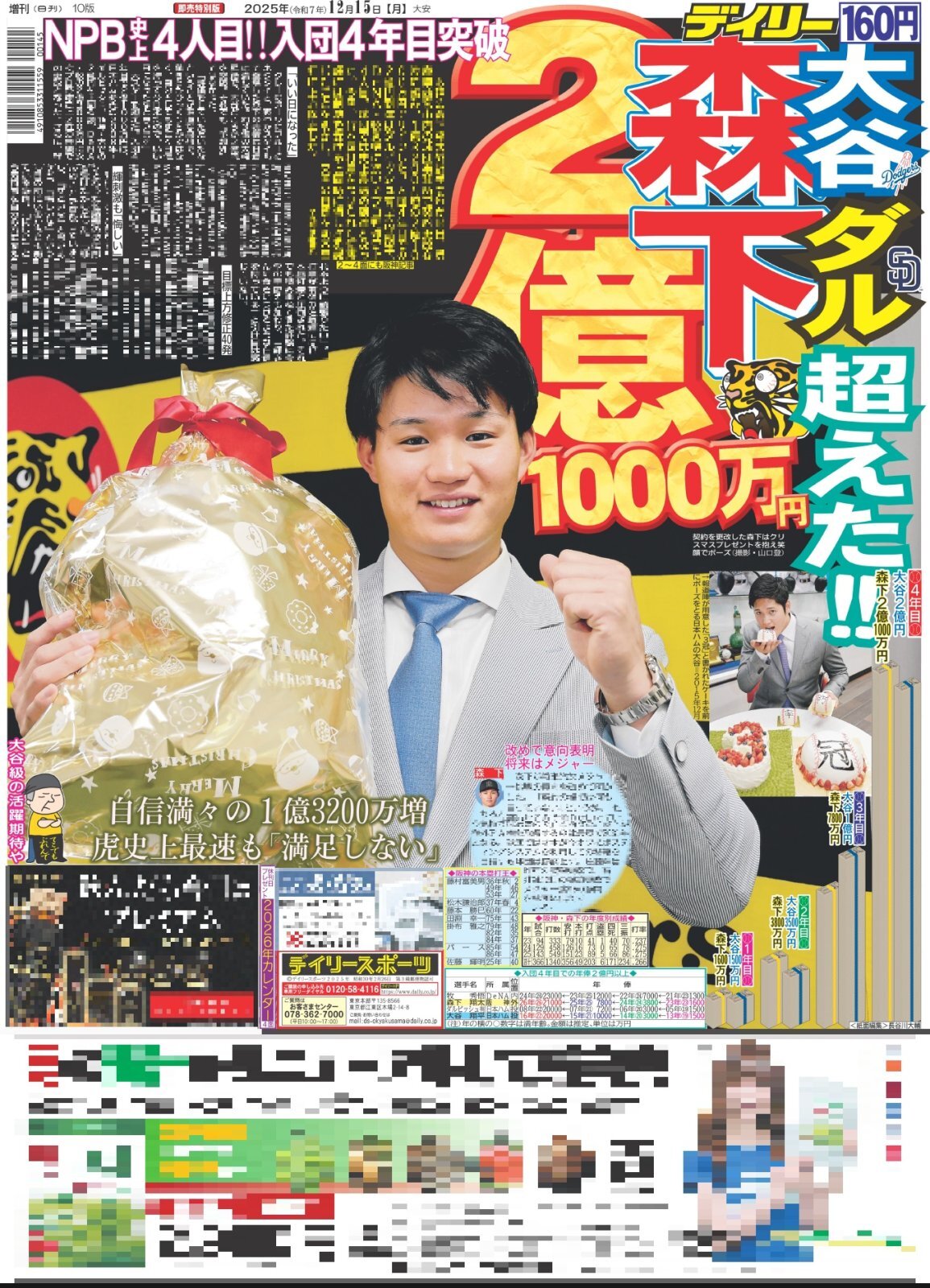 ・一面:森下 大谷 ダル超えた!! 2億1000万円