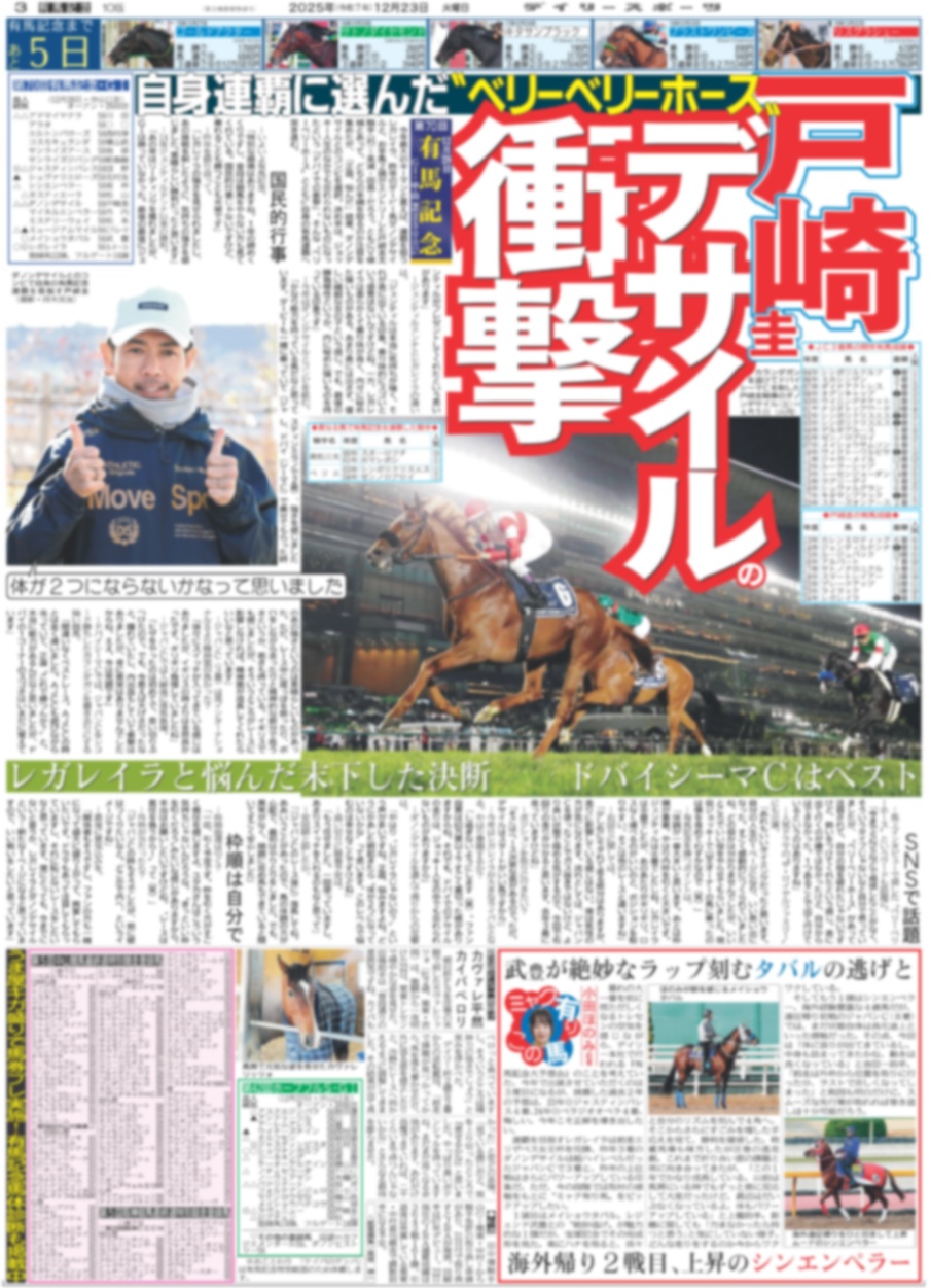 ★掲載内容:SMILE-UP.,STARTO,Snow Man,渡辺翔太,北川景子,有村架純,町田啓太,生瀬勝久,安斉星来,細田佳央太,吉田晴登,ファーストサマーウイカ,unlock,阿部サダヲ,仲里依紗,知英,山口馬木也,菅井友香,NMB48,川上千尋,天海祐希,中央競馬,G1,有馬記念,武豊,熊沢重文,メイショウタバル,レガレイラ,ダノンデサイル,近本光司,藤川球児
