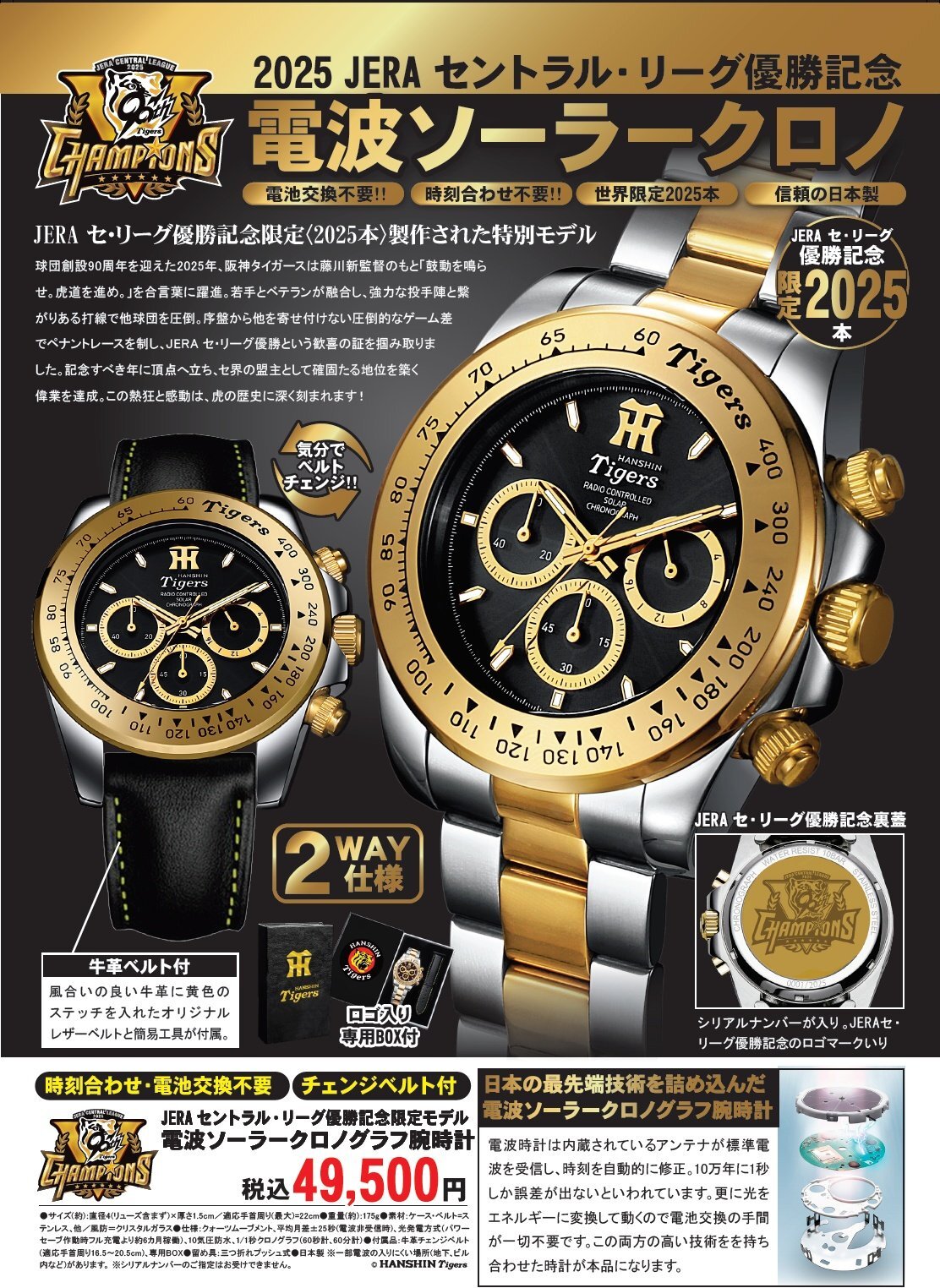 特別限定生産 2025本 1935年創設、今年90周年を迎える阪神タイガースを記念して、特別限定生産2025点の腕時計が登場。裏蓋にはJERA セ・リーグ優勝記念ロゴマークと、唯一無二のエディションナンバーを刻印。阪神ファンにふさわしい、特別な一本です。 ※エディションナンバーは先着順ではなく、完全ランダムでお届け致します。ご指定はいただけません。