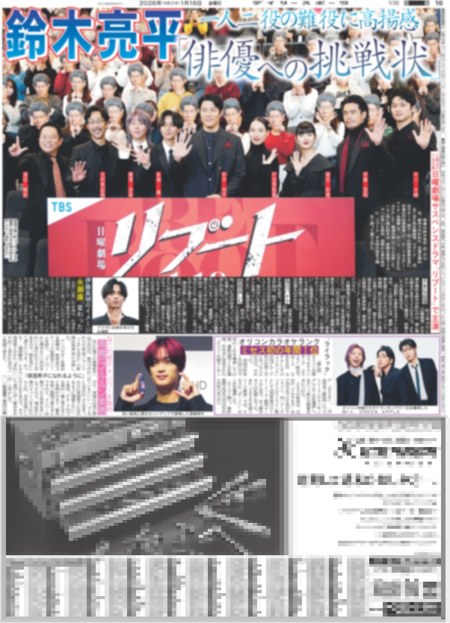 鈴木亮平 「俳優への挑戦状」/ なにわ男子 高橋恭平 プルルン美唇(東京版)2026年1月16日付