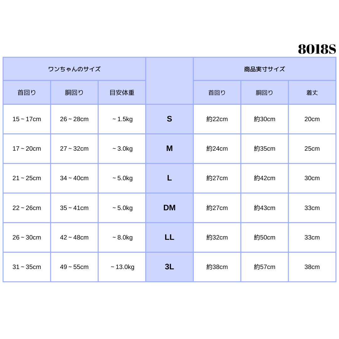 ※DMサイズは胴回りがLサイズと同じサイズで、着丈を長く作っております。Lサイズで着丈が足りないワンちゃんはこちらでも着用可能です。
