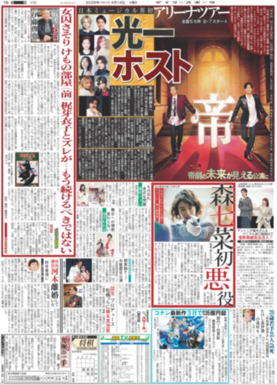 ★掲載内容:ヘタリア,上田悠介,長江崚行,植田圭輔,SMILE-UP.,STARTO,DOMOTO,堂本光一,井上芳雄,平原綾香,佐藤隆紀,岡宮来夢,石丸幹二,桜井玲香,ソニン,島田歌穂,ROIROM,森七菜,石井杏奈,濱田岳,鈴木伸之,板谷由夏,生瀬勝久,山崎賢人,神田泊山,原菜乃華,山時聡真,菅野美穂,風吹ジュン,湖月わたる,朝美絢,才木浩人,松とら屋本舗